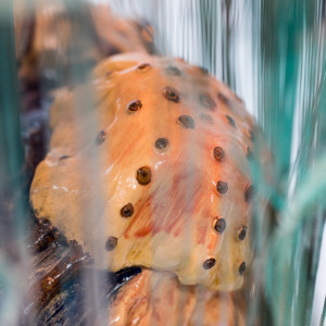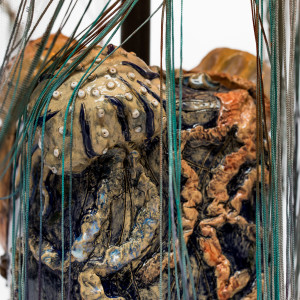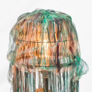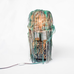 Podstawa lampy przedstawia trzy meduzy na nieregularnej bryle osadzone na drewnianym krążku.
