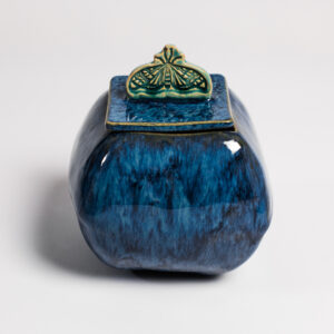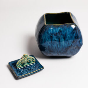 Ceramiczny, ręcznie wykonany pojemnik z ozdobną pokrywką.