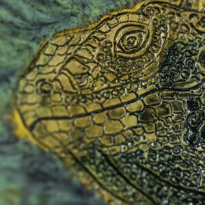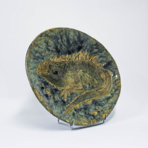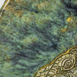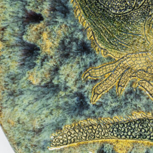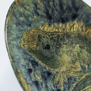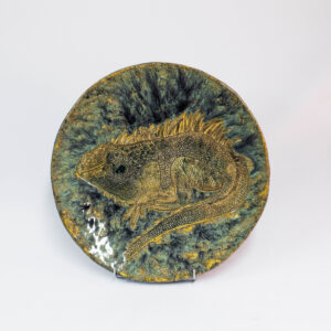 Ceramiczny, duży, ręcznie wykonany talerz z jasnej, beżowej gliny z ozdobnym elementem w postaci wyrytowanego motywu iguany.