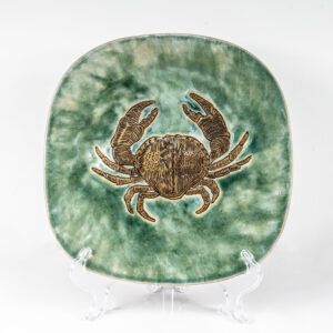Naczynie z ozdobnym elementem w postaci wyrytowanego motywu kraba.