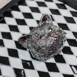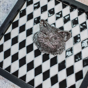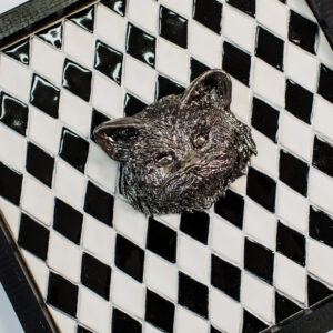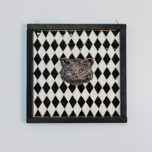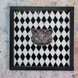 Obraz z ceramiczną płaskorzeźbą perskiego kota znajdującą się