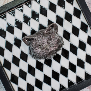 Tło obrazu stanowią ceramiczne, ręcznie wykonane kafelki w kształcie rombów.