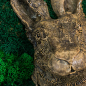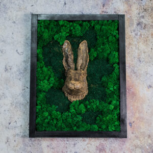 Obraz z ceramiczną płaskorzeźbą królika znajdującą się w centralnej części.